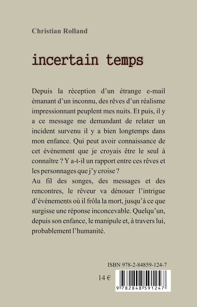 Incertain temps, roman fantastique de Christian Rolland - éditions Zinédi